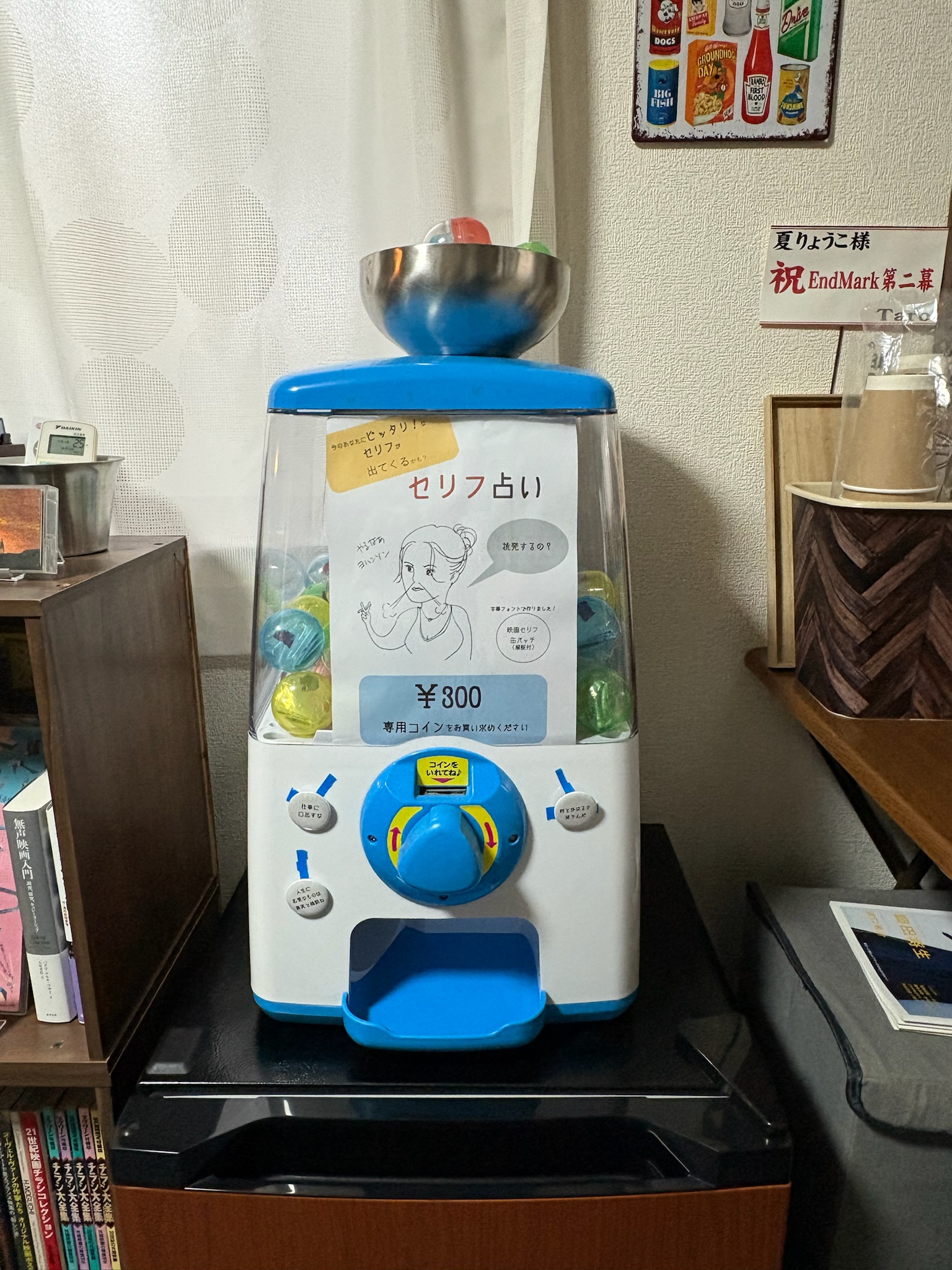 300円でコインを入れると、映画の中で実際に使われたセリフがプリントされた缶バッジがひとつ出