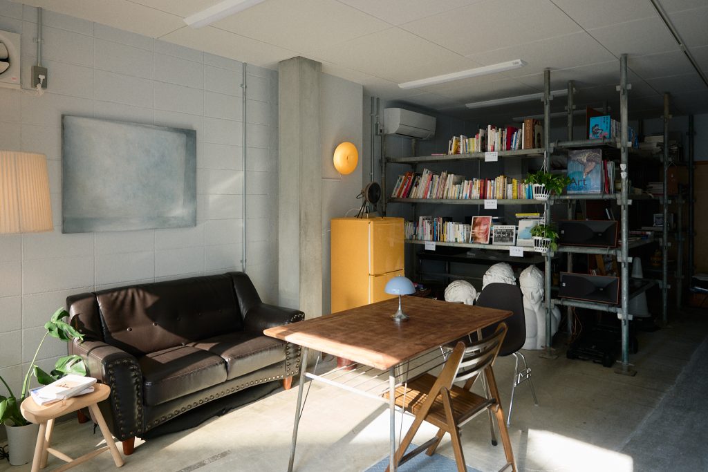 ここは写真家/絵描き/ 草木染め作家という異ジャンルの3人が各部屋に拠点をもって仕事 をしているシェアアトリエです。 1階入口の共用スペースにはそれぞれの蔵書が並び、 自由に閲覧可能となっています。(一部貸出も可)