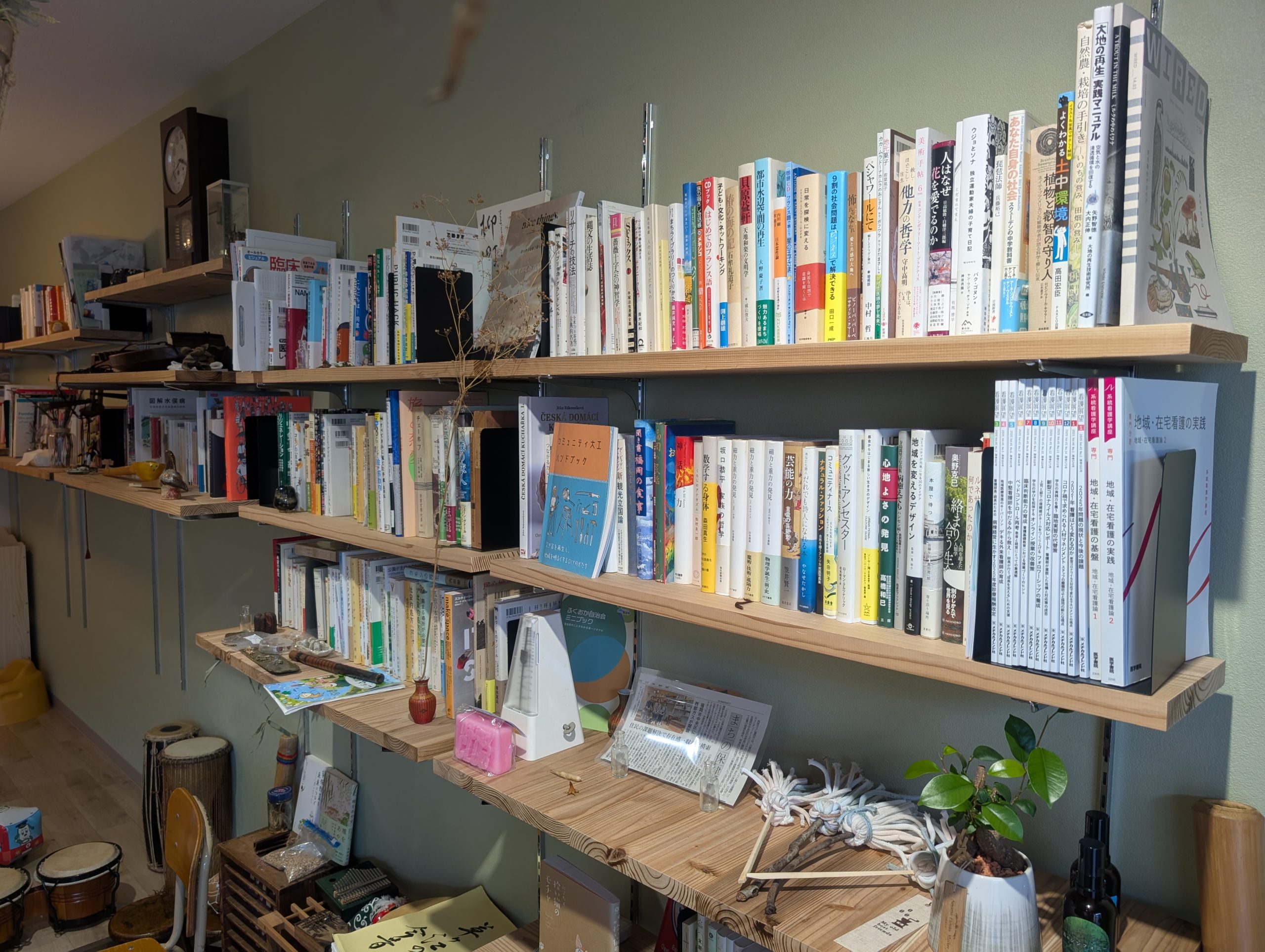 一面ガラス張りで静かな空間には、どこか懐かしい家具やちょっと珍しい楽器、そしてさまざまなジャンルの本が並びます。
